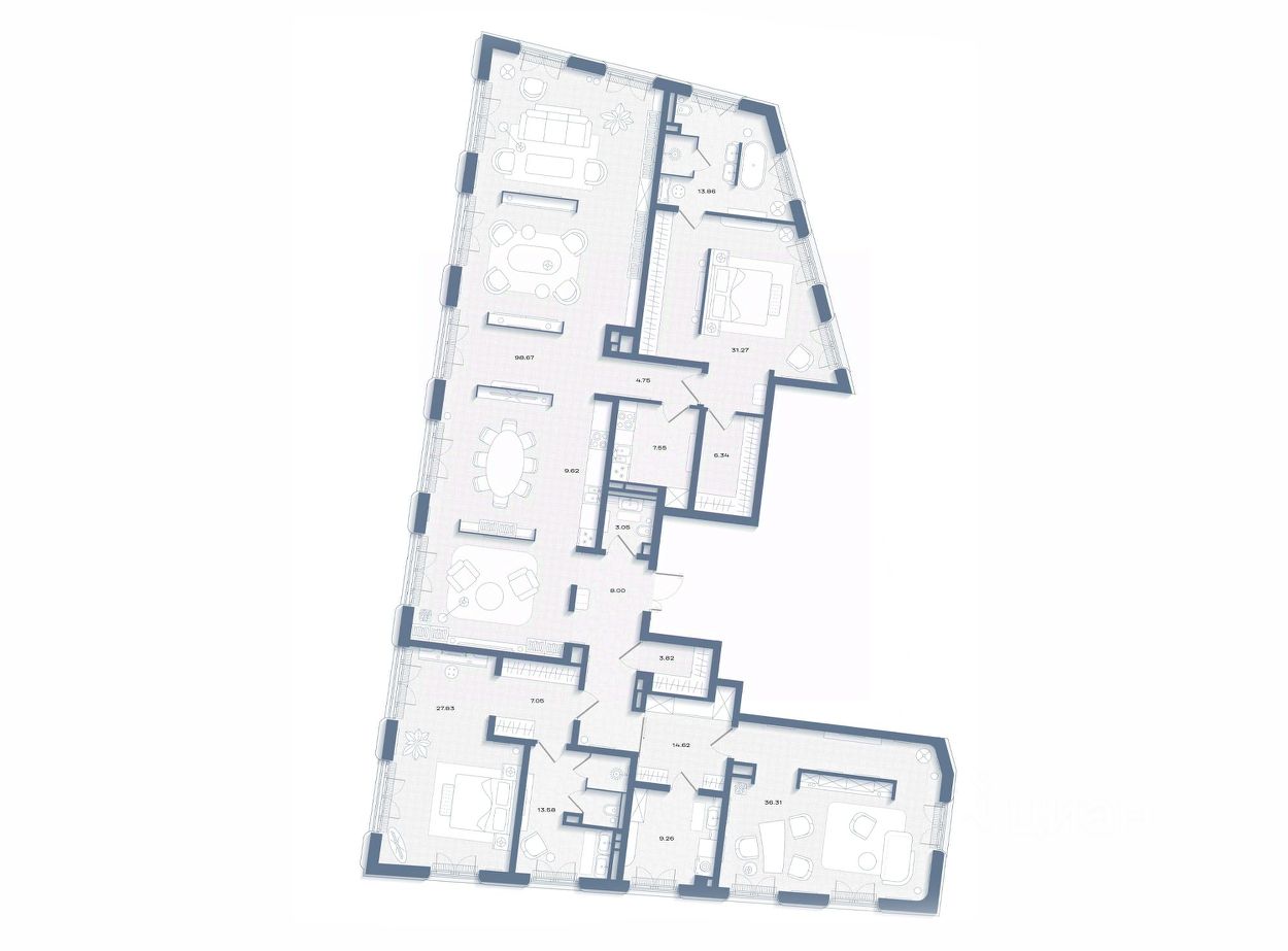 Продаётся 2-комнатная квартира общей площадью 295.58 м² без отделки на 8-м этаже в корпусе 1 проекта Дом Соболева.