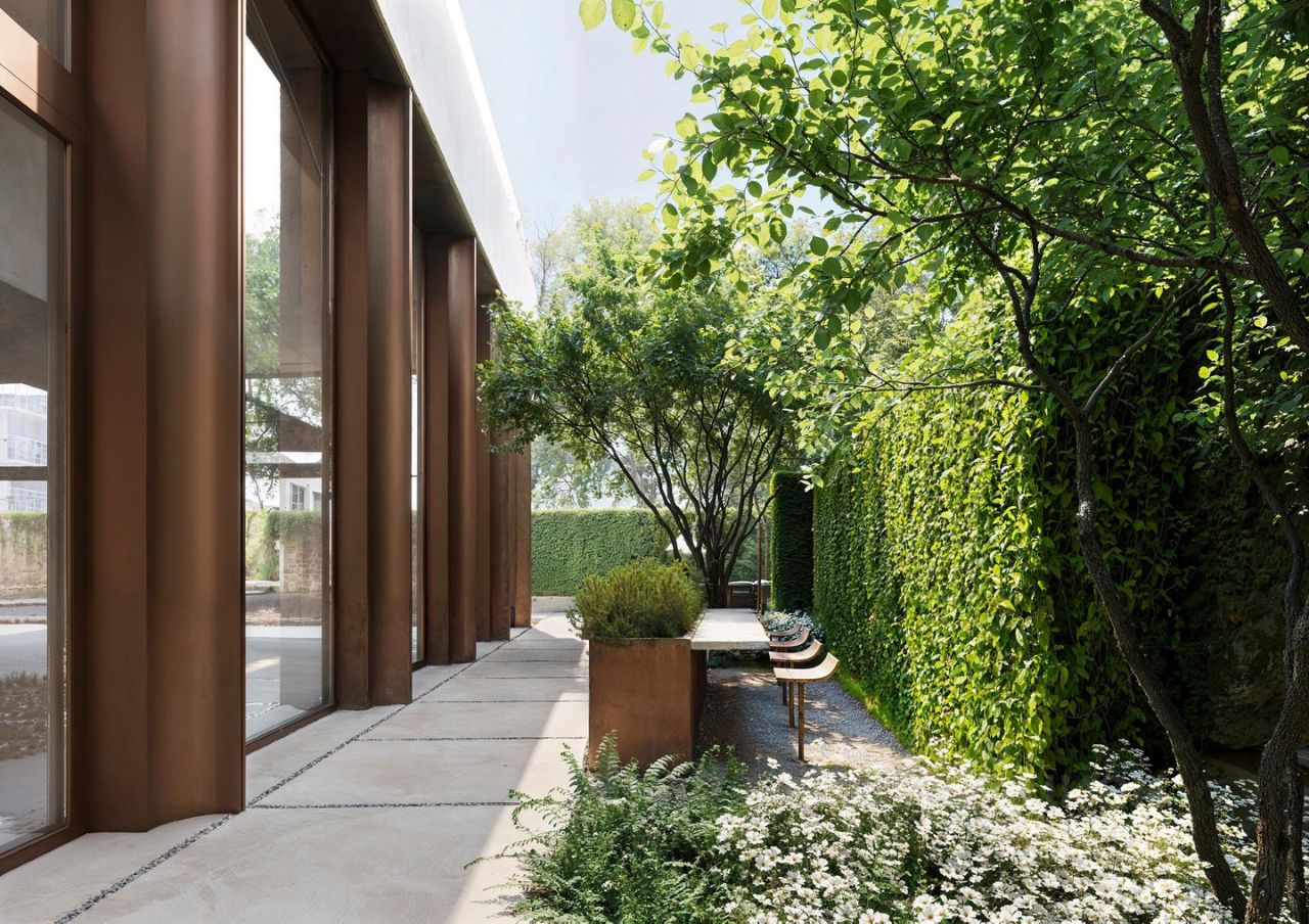 На благоустроенной приватной территории Дома Соболева предусмотрено пространство с несколькими функциональными зонами. Общественная открытая гостиная зона для встречи с друзьями, приватные места для отдыха с книгой и зона для работы на улице с высоким столом.