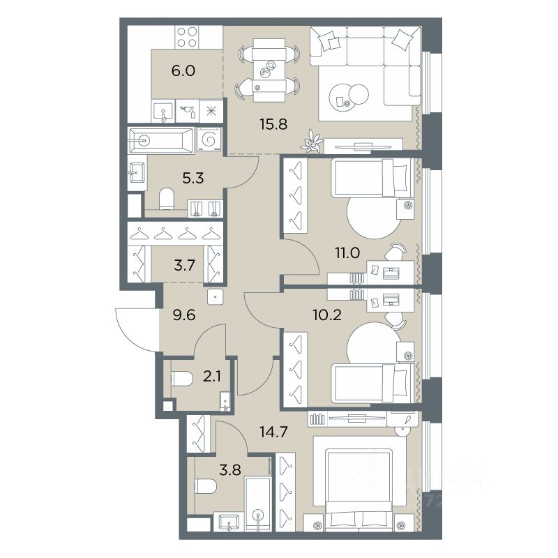 В проекте представлены квартиры на любой вкус и состав семьи: студии, классические и европланировки, 4- и 5-комнатные квартиры больше ста метров. Все помещения предлагаются без отделки.