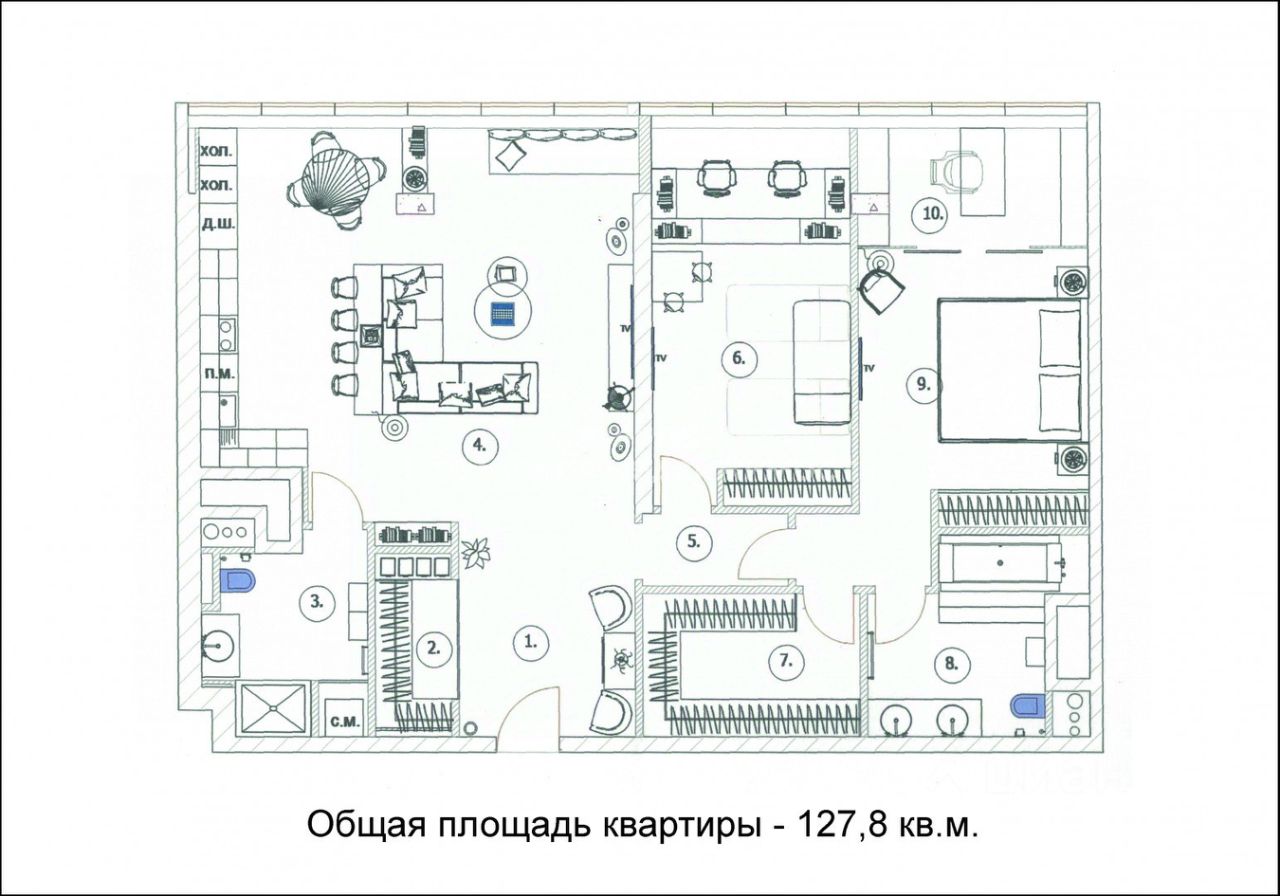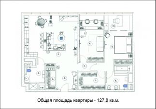 Общая площадь квартиры - 127,8 кв.м.