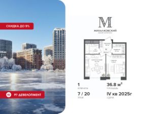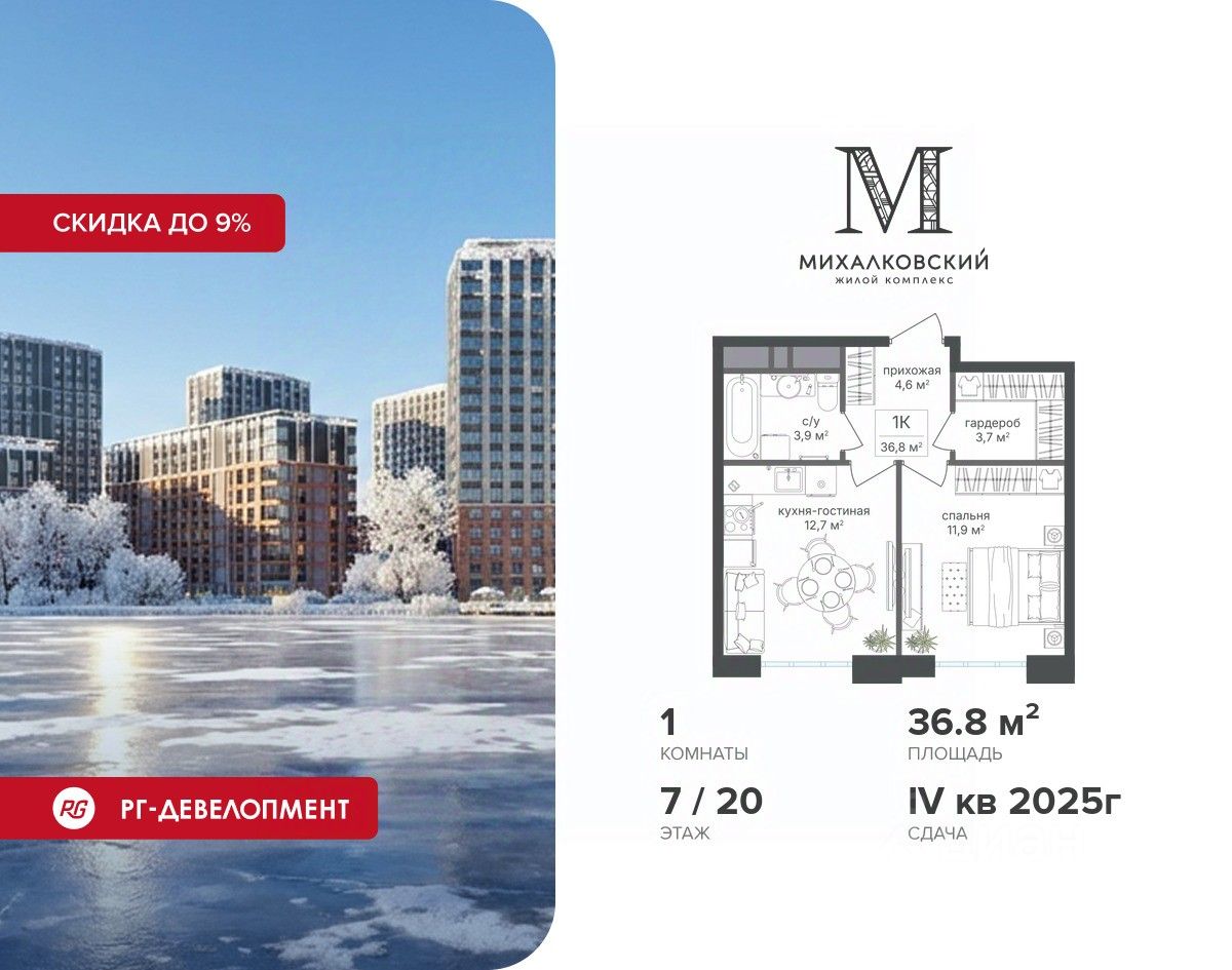 Продаётся 1-к квартира 36,8 кв.м. в ЖК "Михалковский" на 7-м этаже 20 этажного дома.