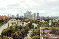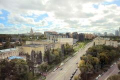 Окна от пола до потолка открывают красивые панорамные виды на Воробьевы горы и ОК "Лужники".
