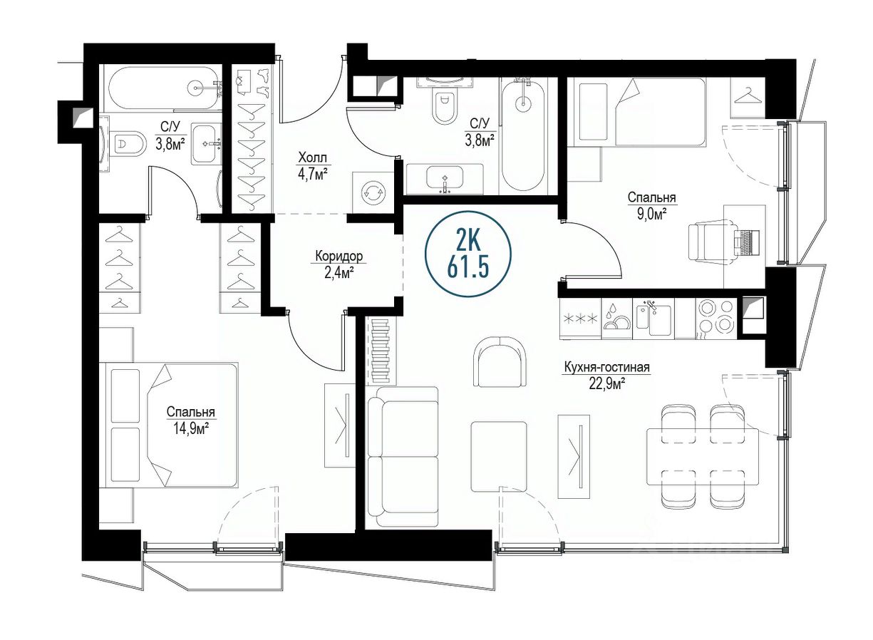 Продаётся 2-комнатная квартира общей площадью 60.40 м², на 4 этаже.