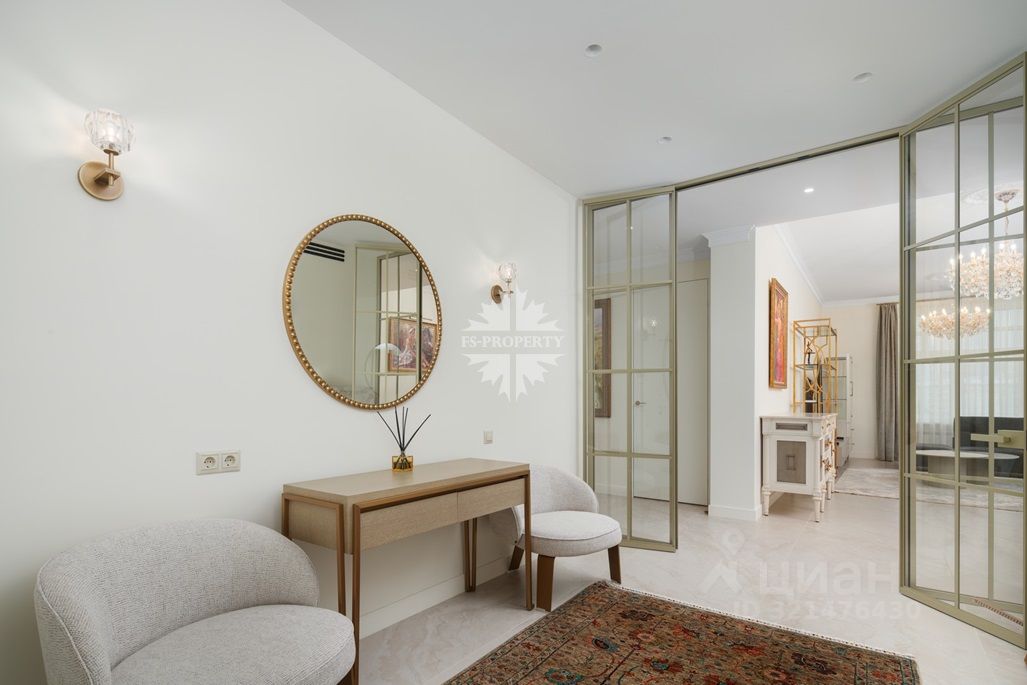 Выполнена отделка категории de luxe в классическом стиле с использованием натуральных материалов, в том числе мрамора, массива дуба.