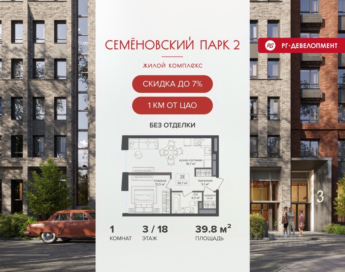 Продается 1-к квартира 39,8 кв.м. в ЖК "Семеновский парк 2" на 3-м этаже 18 этажного дома.
