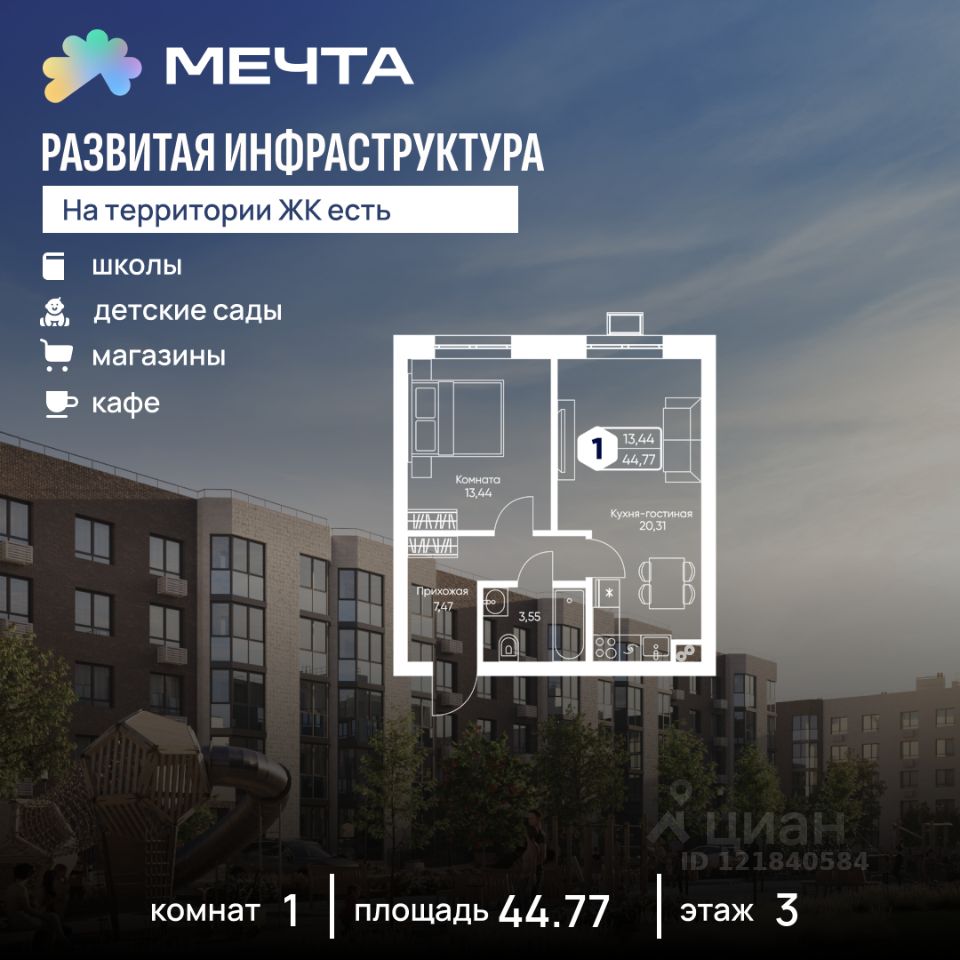 Продается однокомнатная квартира в квартале "Дружба" жилого комплекса "Мечта". Общая площадь квартиры: 44.77 кв. м, этаж 3 из 5.