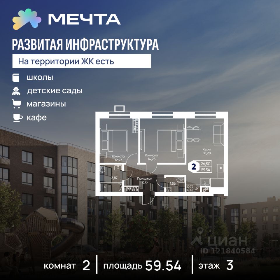 Общая площадь квартиры: 59.54 кв. м, этаж 3 из 5.
