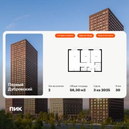 Продаётся 2-комн. квартира площадью 56,3 кв.м на 30 этаже 33 этажного дома (Корпус 1.3, Секция 1) проекта ПИК Первый Дубровский. Светлый просторный подъезд на уровне земли, функциональная планировка, большие окна, c отделкой.
