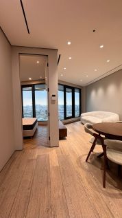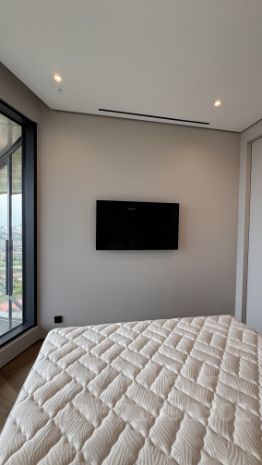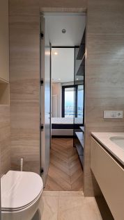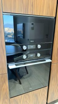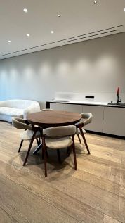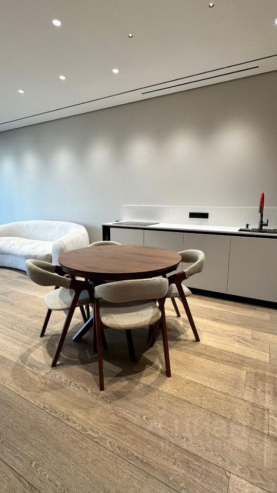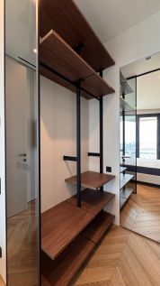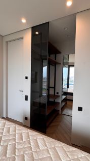 Квартира укомплектована дорогостоящей мебелью (фасады шпон и эмаль), техника премиум класса ТЕКА и ASKO (холодильник, духовой шкаф, винный шкаф, микроволновая печь, посудомоечная машина, варочная панель с вытяжкой, стиральная и сушильная машина), сантехникой Boheme и Omoikiri, системой канального кондиционирования чиллер-фанкойл, крупноформатный испанский керамогранит Porcelanosa в санузлах и на полу,
