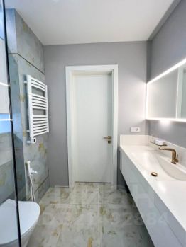Плитка на полу всей квартиры и одного санузла испанского бренда Apaviso, второй санузел выполнен в мягком приглушенном теплом коричневом цвете с применением итальянского керамогранита бренда Panaria Prime Stone.
