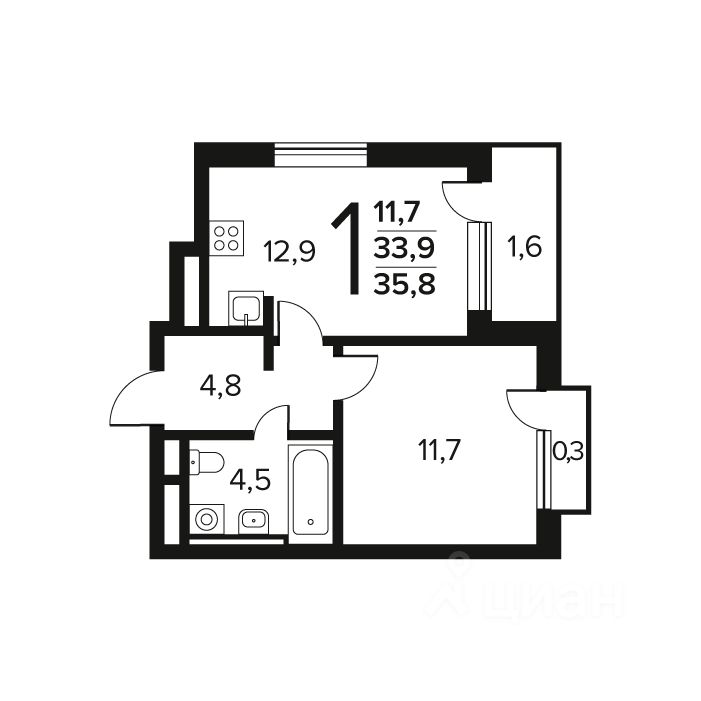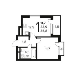 Общая площадь: 35.8 кв.м., жилая: 11.7 кв.м., площадь кухни: 12.9 кв.м. Этаж: 8.