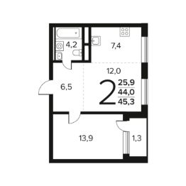Общая площадь: 45.3 кв.м., жилая: 25.9 кв.м., площадь кухни: 7.4 кв.м. Этаж: 11.