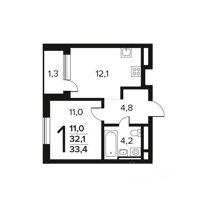Общая площадь: 33.4 кв.м., жилая: 11.0 кв.м., площадь кухни: 12.1 кв.м. Этаж: 8.