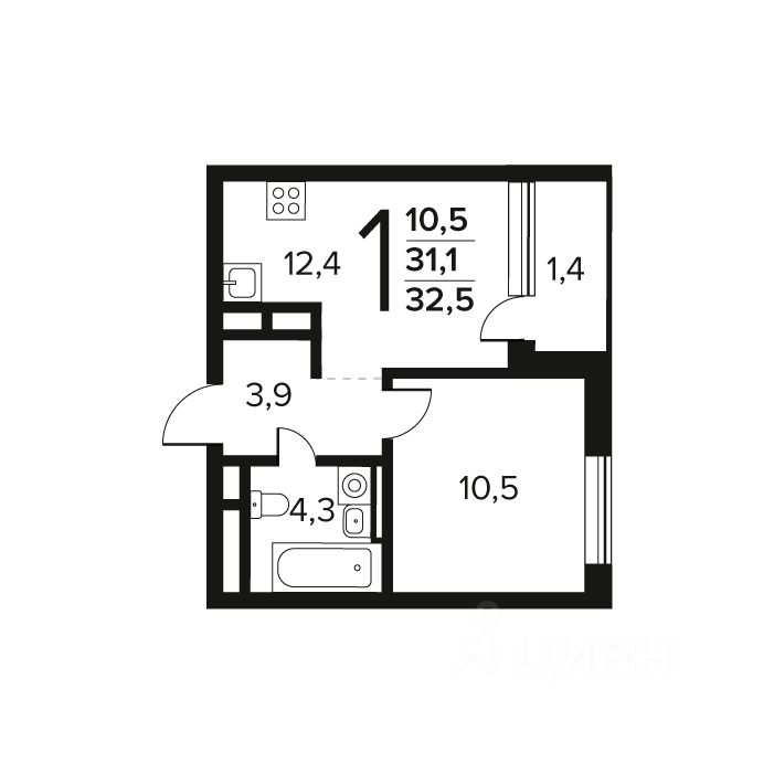 Общая площадь: 32.5 кв.м., жилая: 10.5 кв.м., площадь кухни: 12.4 кв.м. Этаж: 10.