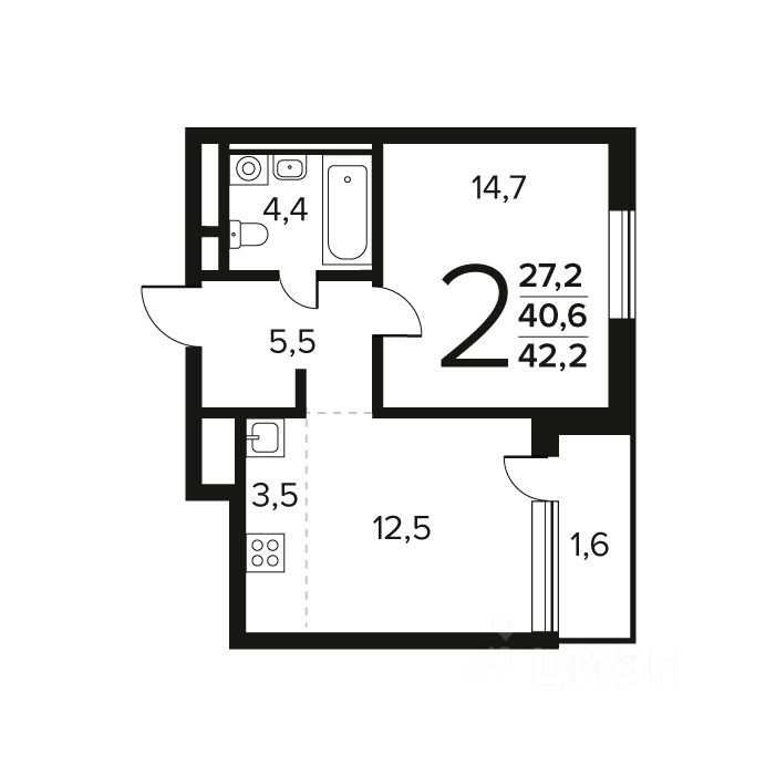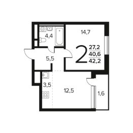 Общая площадь: 42.2 кв.м., жилая: 27.2 кв.м., площадь кухни: 3.5 кв.м. Этаж: 7.