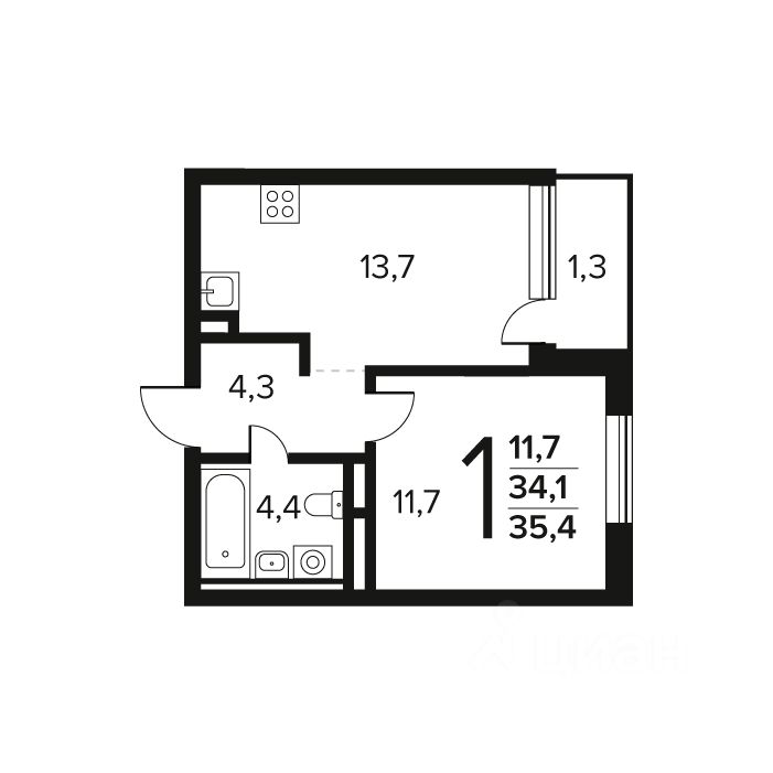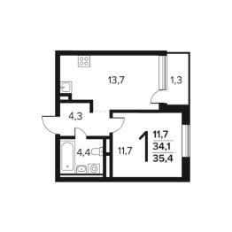 Общая площадь: 35.4 кв.м., жилая: 11.7 кв.м., площадь кухни: 13.7 кв.м. Этаж: 7.