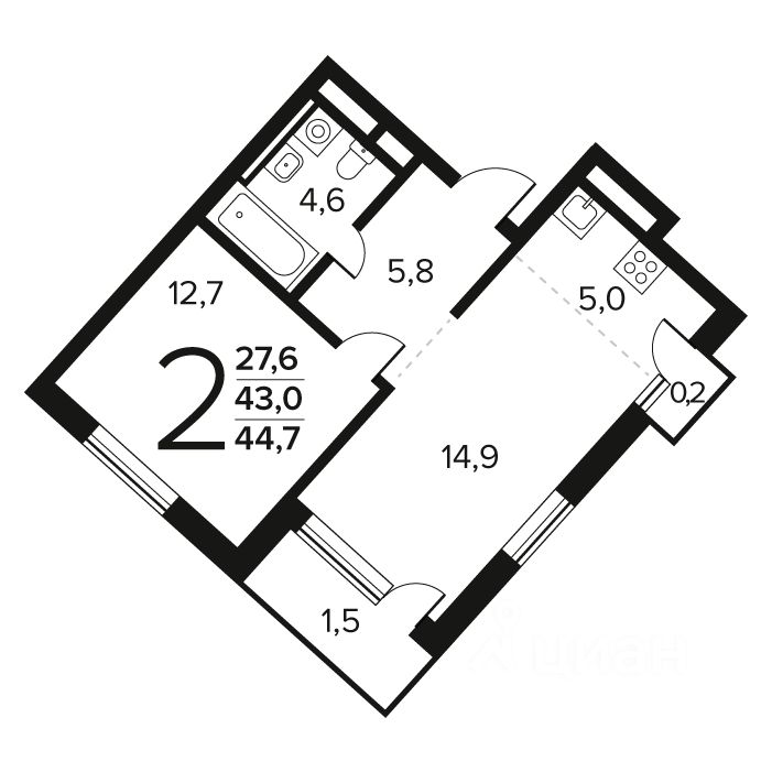 Общая площадь: 44.7 кв.м., жилая: 27.6 кв.м., площадь кухни: 5.0 кв.м. Этаж: 11.