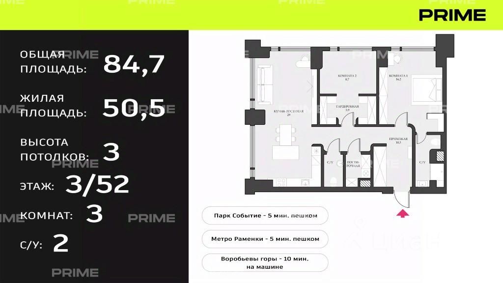 Квартира расположена на 3 этаже, главное преимущество - вид, который открывается из окон на зеленые Раменки. Квартира угловая - 5 окон! На 85 м2 были сформированы просторная кухня-гостиная с зонированием на место для отдыха и обеденную зону, мастер спальня с собственным с/узлом и гардеробной, вторая спальня с полноценной гардеробной, которую можно использовать, как кабинет или детскую комнату, гостевой с/узел, большая постирочная и просторная прихожая. В квартире выполнен дизайнерский ремонт из качественных материалов. Создано тактильное пространство, сочетающее природные цвета и фактуры: дерево и камень. Напольное покрытие - крупноформатный керамогранит (полы с подогревом), а в спальнях паркетная доска. Все стены квартиры - декоративная штукатурка. Вся деревянная фактура - шпон! В квартире установлена система приточно-вытяжной вентиляции. Также выполнено разноуровневое освещение. Кухня оборудована всей необходимой мебелью и техникой. Холодильник Liebherr, духовой шкаф, индукционная плита и посудомоечная машина - Asko, также установлен очистительный фильтр. Входная дверь с замком по Face ID и отпечатку пальцев. Установлен домофон с видеонаблюдением на входную группу.