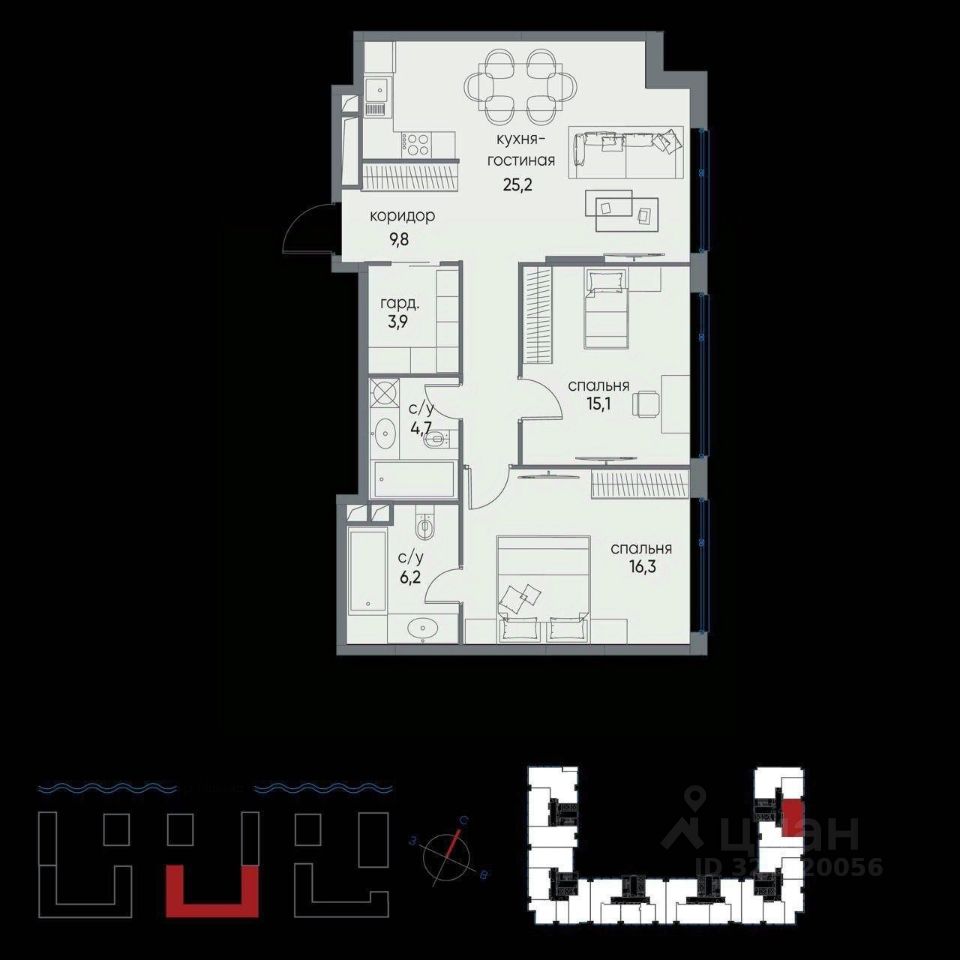 Комнаты: Просторная кухня-гостиная, 2 комната правильной формы, 2 комфортных санузла, гардеробная