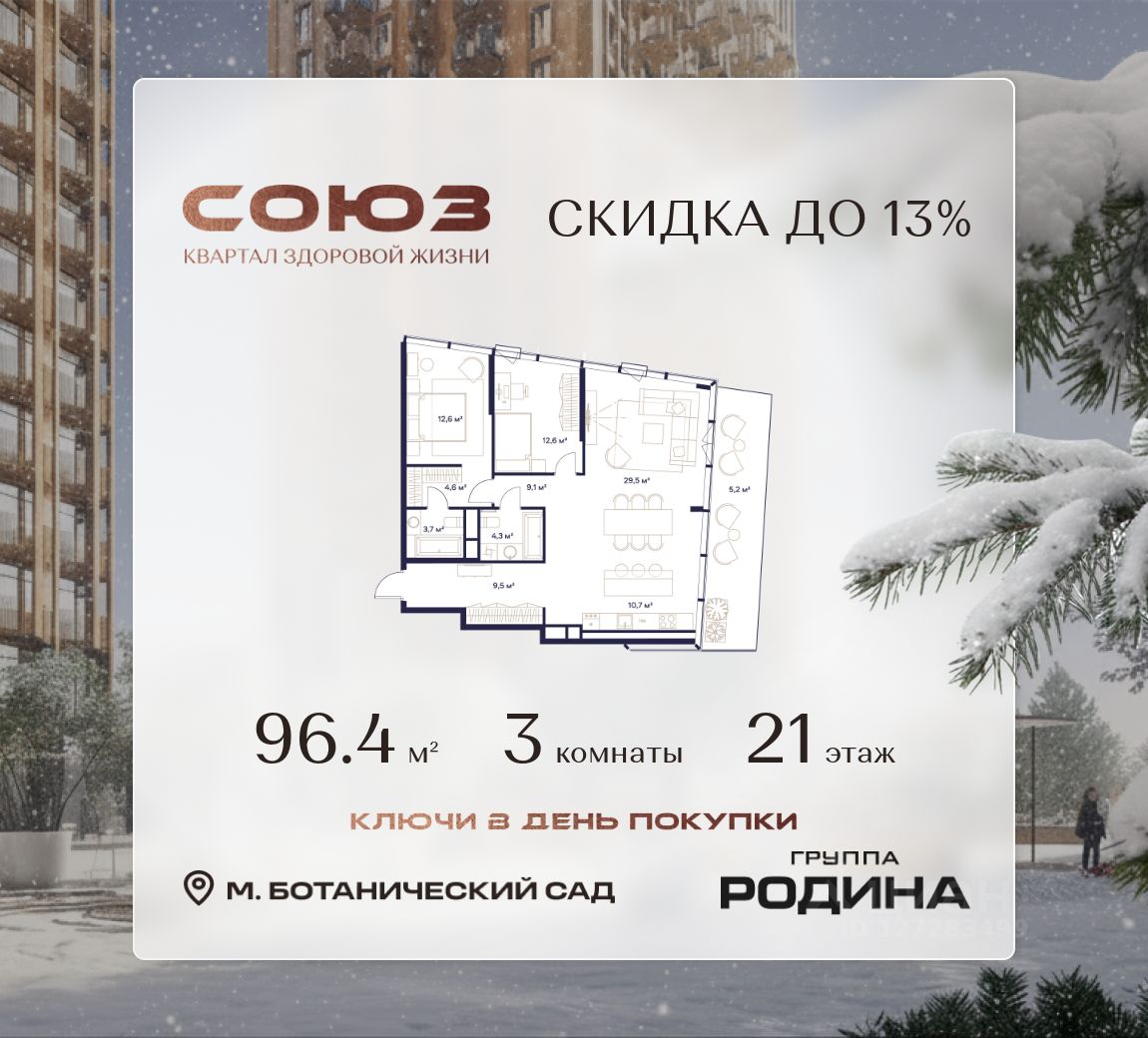 Продаётся 3-комнатная квартира площадью 96.4 м² на 21 этаже в Жилом Комплексе "Союз".