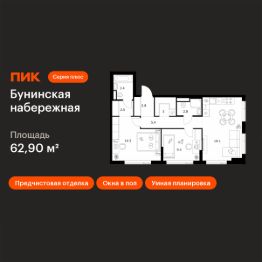 Продаётся 2-комн. квартира площадью 63 кв.м на 3 этаже 16 этажного дома (Корпус 2.6/1.2, Секция 2) проекта ПИК Бунинская набережная. Светлый просторный подъезд на уровне земли, функциональная планировка, большие окна, предчистовая отделка.