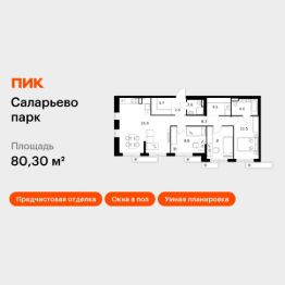 Продаётся 3-комн. квартира площадью 80,3 кв.м на 12 этаже 15 этажного дома (Корпус 57.2, Секция 2) проекта ПИК Саларьево парк. Светлый просторный подъезд на уровне земли, функциональная планировка, большие окна, предчистовая отделка.