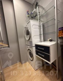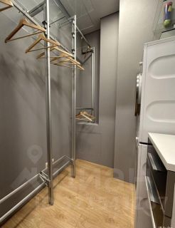 В гардеробной удобная и функциональная система хранения, стиральная и сушильная машина Аskо.