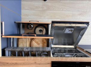 Кухня вся укомплектована техникой: СВЧ печь, духовка, большая посудомоечная машина 60 см, индукционная плита, вытяжка, холодильник фильтр для воды. Вся техника высокого класса.