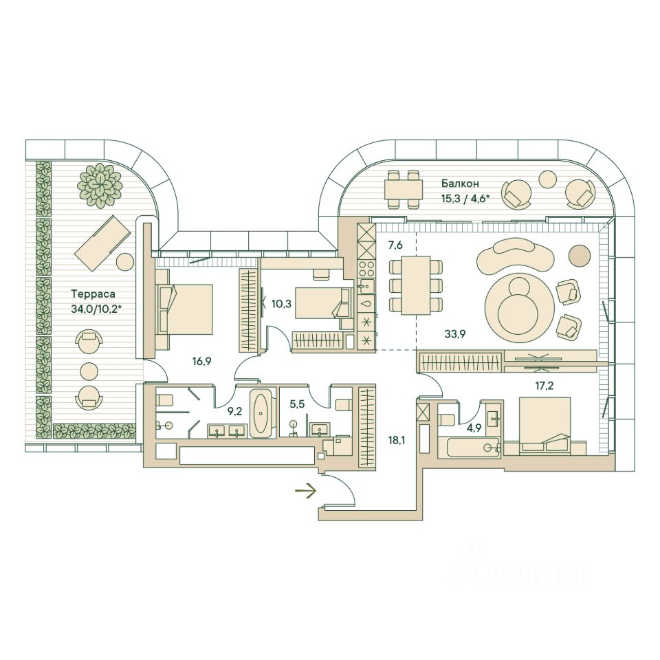 Четырёхкомнатная wellness-резиденция площадью 137.1 кв. м. на 5 этаже с видом на парк и центр в доме премиум-класса Springs.