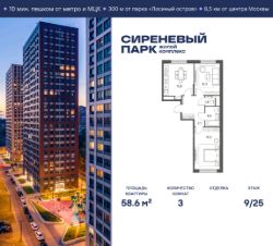 Продаётся просторная 3-комнатная квартира общей площадью 58.6 м² на 9 этаже в новом жилом комплексе "Сиреневый парк", расположенном в Восточном административном округе Москвы на улице Тагильская. Всего 10 минут ходьбы от станции метро "Бульвар Рокоссовского" и одноимённой платформы МЦК.