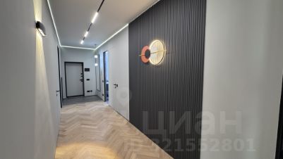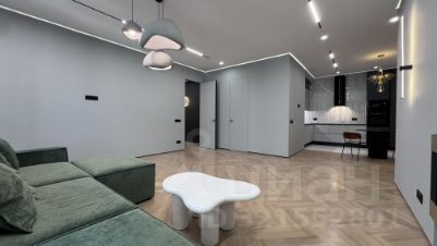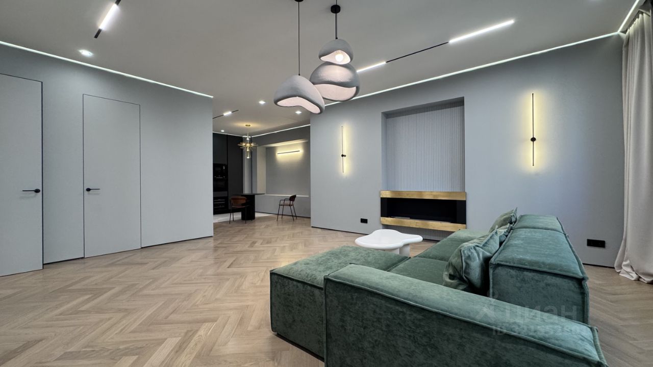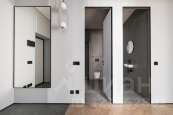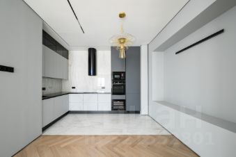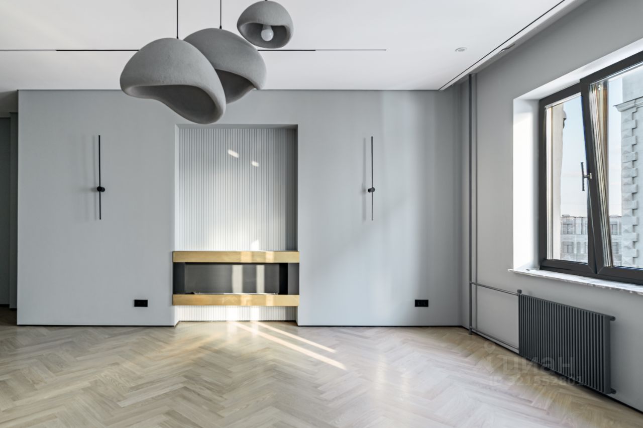 Ультрамодный современный дизайн. Интерьер - спокойные цвета и чистые линии. Скрытые межкомнатные двери декорированы в цвет стен. Преобладает серый цвет, который не просто очень моден, он хорошо подходит как классической, так и современной мебели. Разнообразие в интерьер вносят текстуры, создающие яркие акценты. Теневой плинтус приносит эффект парящих стен. Паркет из натурального дерева.
