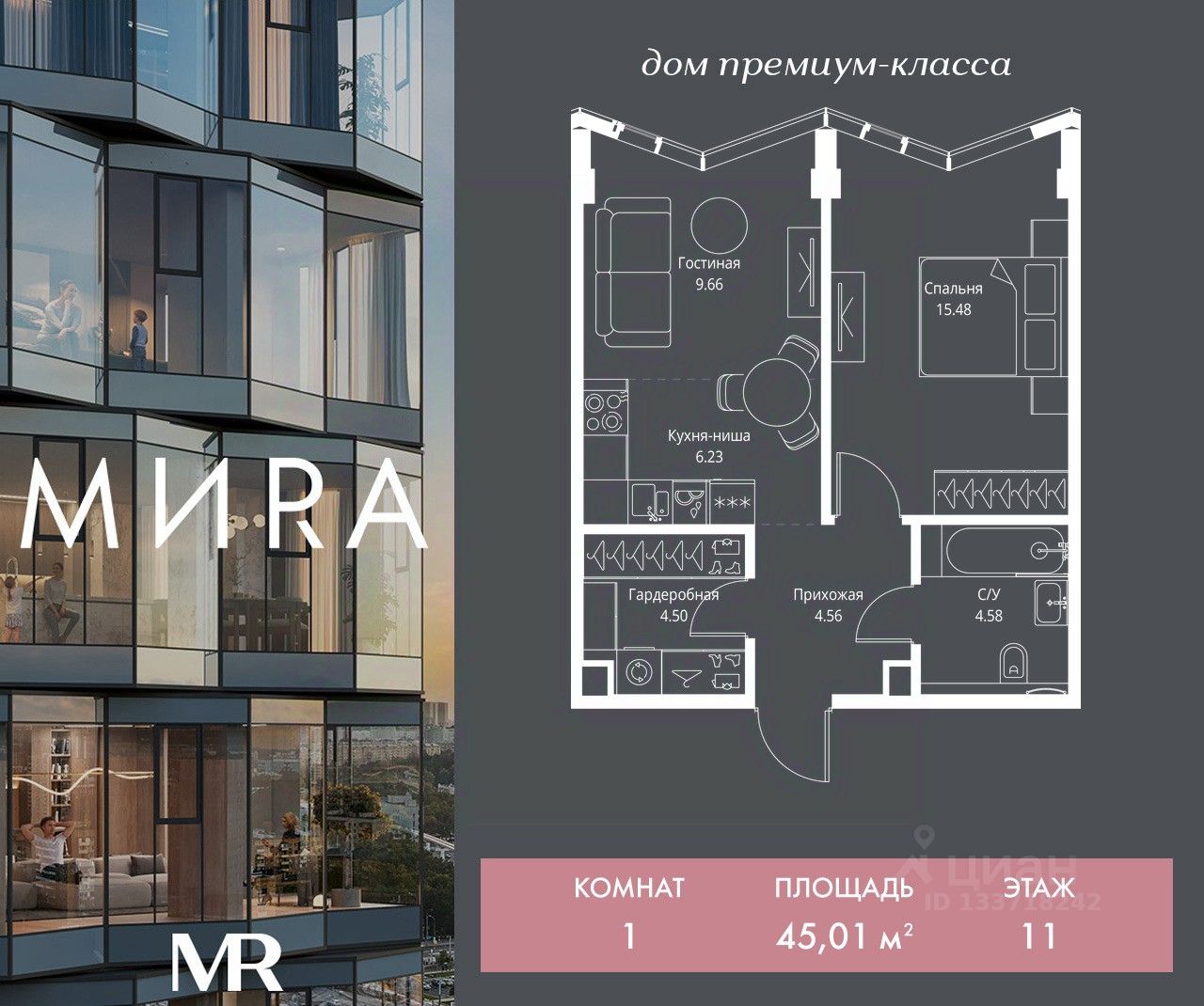 Продаётся 1-комнатная квартира общей площадью 45.01 м² без отделки в доме премиум-класса МИRА на 11-м этаже 24 этажного дома. Квартира расположена в корпусе 3.