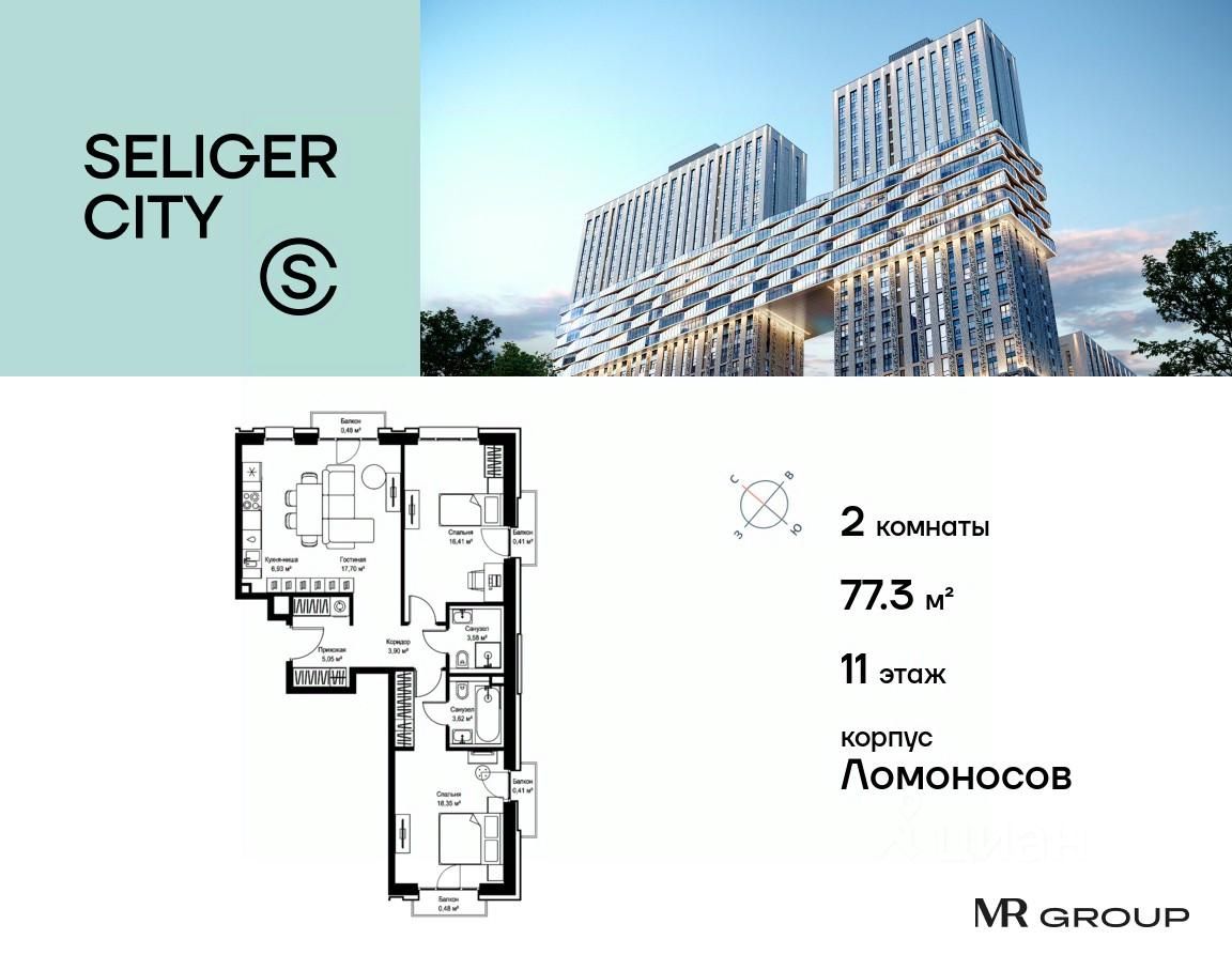 Продаётся 2-к квартира общей площадью 77.32 м² без отделки в ЖК "Селигер Сити" на 11-м этаже корпуса Ломоносов.
