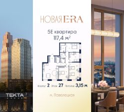 5-комн. квартира в ЖК "Era" на 27 этаже в 33 этажном здании Корпус 2. Общая площадь: 117.4 кв.м., жилая: 79.30 кв.м. Высота потолков 3.15 м.