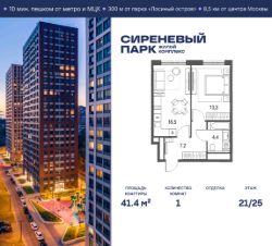 Продаётся просторная 1-комнатная квартира общей площадью 41.4 м² на 21 этаже в новом жилом комплексе "Сиреневый парк", расположенном в Восточном административном округе Москвы на улице Тагильская. Всего 10 минут ходьбы от станции метро "Бульвар Рокоссовского" и одноимённой платформы МЦК.