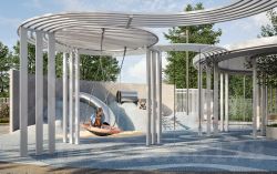 Во внутреннем приватном дворе будет создано пространство в бионическом стиле с лаунж-зонами, подвесными качелями, детскими плейхабами для разных возрастов, площадками для спорта и отдыха в окружении зелени.