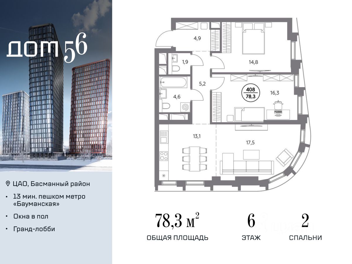 В премиум-квартале "Дом 56" на Бауманской напрямую от девелопера ГК "Галс-Девелопмент" представлена 2-комнатная квартира на 6 этаже общей площадью 78.30 м².