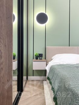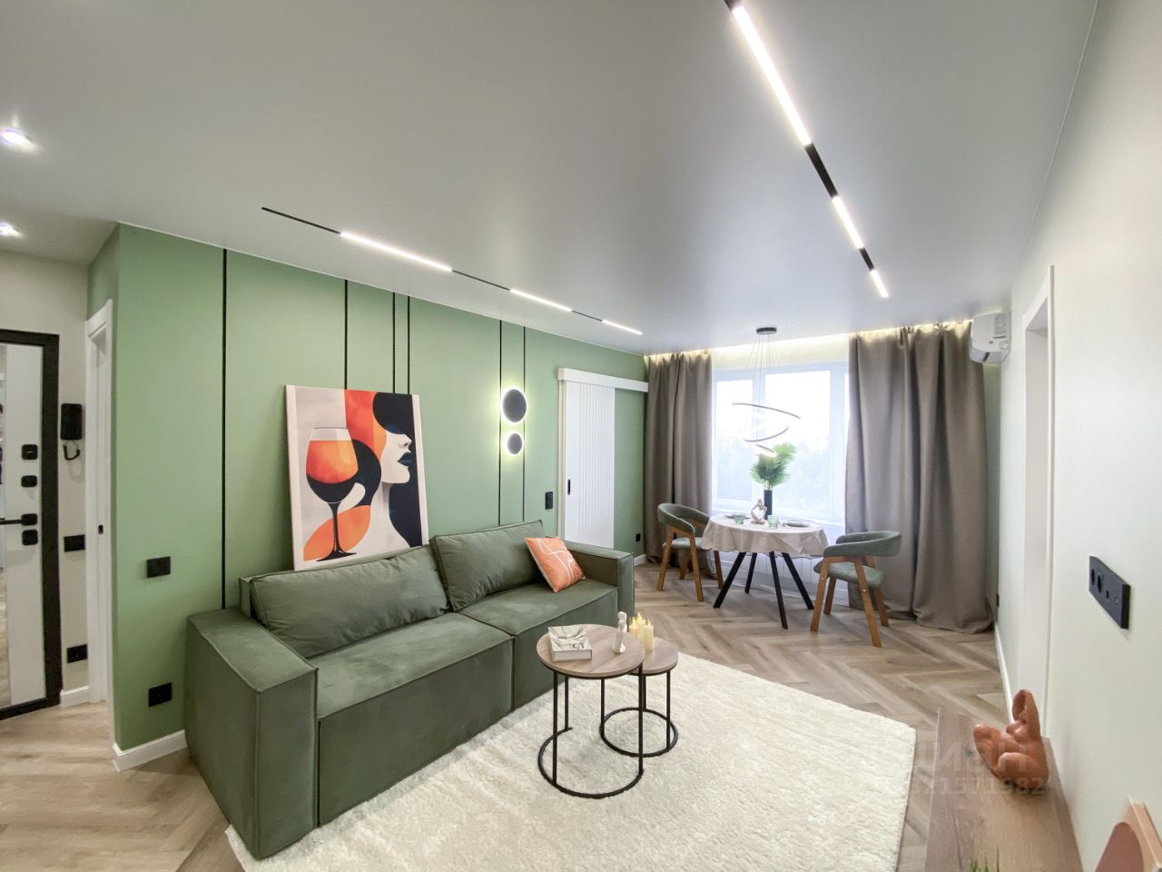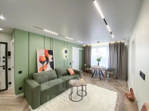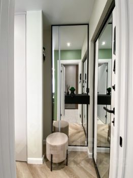 В квартире по плану: две спальные комнаты, в одной из комнат большой застекленный балкон, кухня-гостиная с возможностью зонировать гостиную от кухни раздвижной дверью. Шкафы в гостиной и спальне решают вопрос дефицита мест хранения. Вся встроенная мебель изготовлена по индивидуальному эскизу, на заказ. Кровать с ортопедическим матрасом и подъемным механизмом. В гостиной - раскладной диван. Стол в обеденной зоне также имеет раскладной механизм. На кухне есть 2 дополнительных места для приема пищи в суетливое утреннее время. Для выполнения ремонта использованы дорогие отделочные материалы, плитка из керамогранита в ванной, премиальный кварцвинил английская елка на полу в гостиной, комнатах и кухни, которому не страшен даже потоп. Пол в ванной с подогревом.