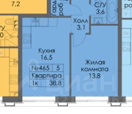 Общая площадь 38.8м2 , из которых кухня - гостиная 16.5м2.