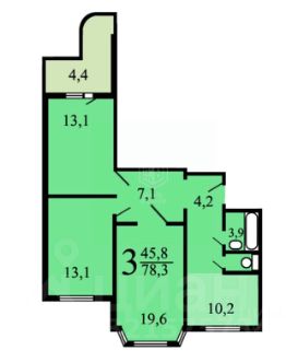 Параметры: Общая площадь квартиры 74,8 м², жилая площадь 44 м², площадь кухни 10 м².
