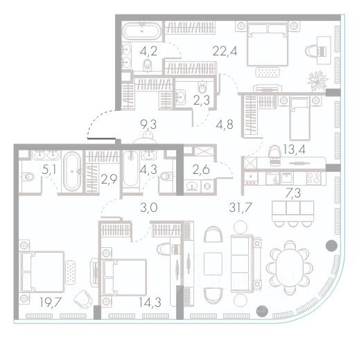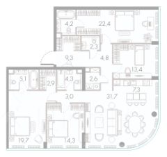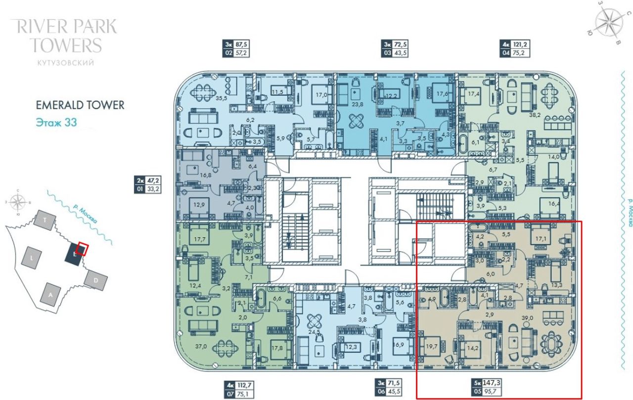Продается шикарная 5Е квартира с 4 спальнями и просторной кухне-гостиной площадью 147,3 м2, высота потолка 3,4 метра, на 33 этаже с пред-чистовой отделкой в уникальном проекте премиум-класса River Park Towers Кутузовский в Башне EMERALD Tower (корпус 2). С прямым видом на набережную Москвы-Реки и небоскребы Москва-Сити и центр Москвы!