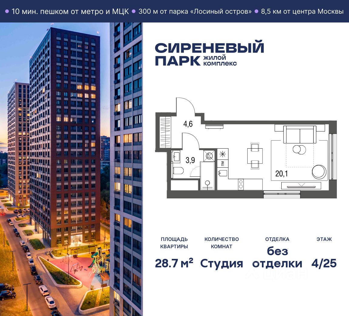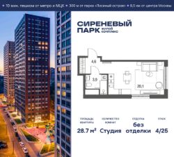 Продаётся просторная студия общей площадью 28.7 м² на 4 этаже в новом жилом комплексе "Сиреневый парк", расположенном в Восточном административном округе Москвы на улице Тагильская. Всего 10 минут ходьбы от станции метро "Бульвар Рокоссовского" и одноимённой платформы МЦК.