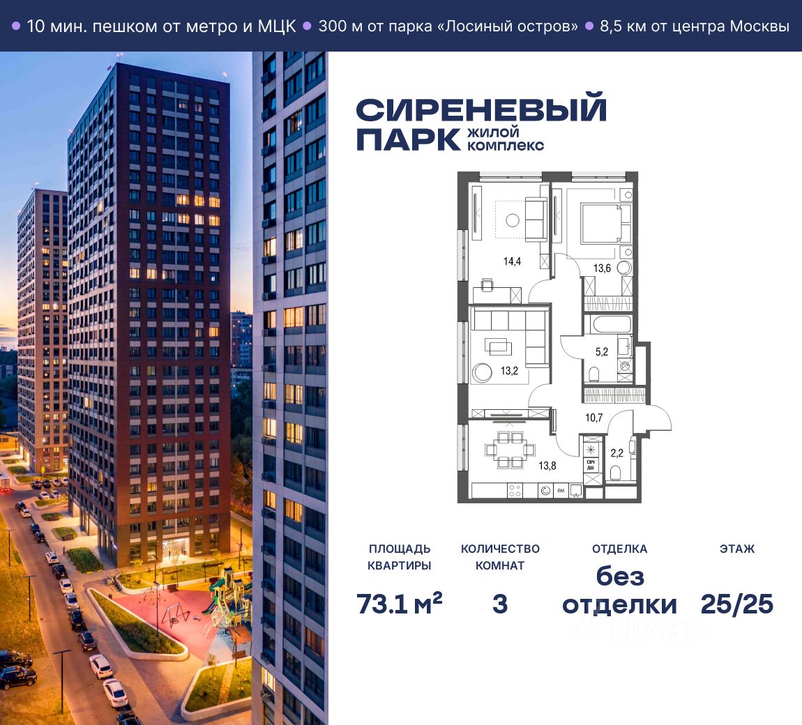 Продаётся просторная 3-комнатная квартира общей площадью 73.1 м² на 25 этаже в новом жилом комплексе "Сиреневый парк", расположенном в Восточном административном округе Москвы на улице Тагильская. Всего 10 минут ходьбы от станции метро "Бульвар Рокоссовского" и одноимённой платформы МЦК.