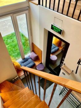 Высокие потолки и окна с видом в парк в сторону церкви Федора Ушакова и реки. Между колокольными перезвонами тихо и поют птицы. Дом в парке Северного речного вокзала возле благоустроенной набережной. Очень красивое и тихое место для отдыха на уровне курорта.