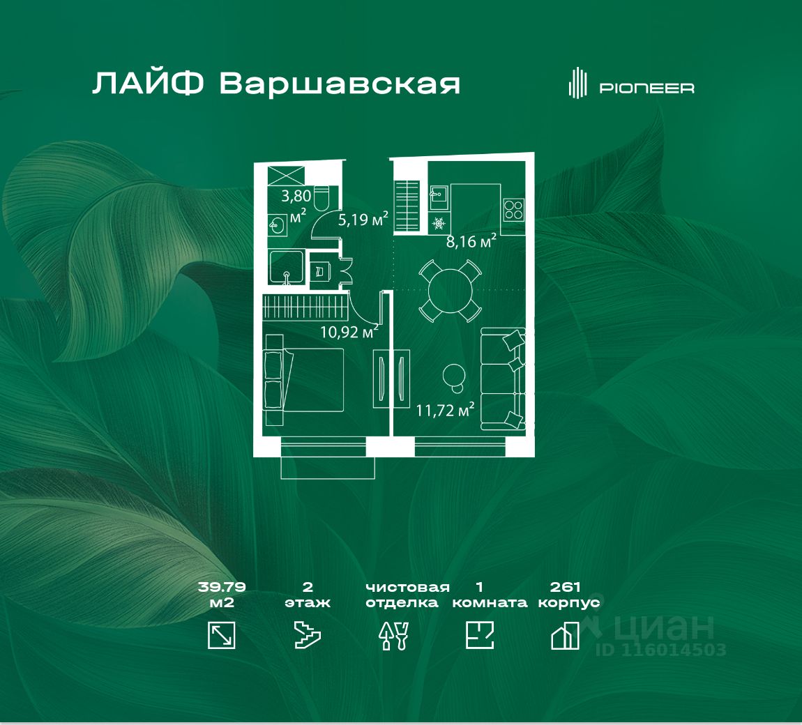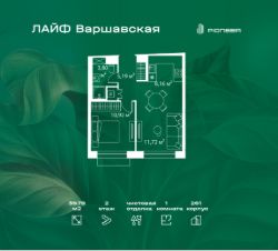 В районе Москворечье-Сабурово продается 1-комнатная квартира площадью 39.79 м². Она расположена на 2 этаже в 261 корпусе нового жилого квартала Лайф Варшавская.