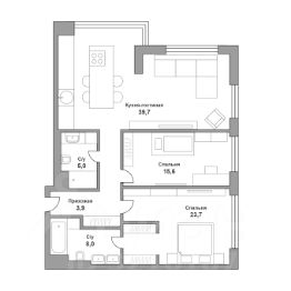 Функциональная планировка включает просторную кухню-гостиную, мастер-спальню с отдельной ванной комнатой, вторую спальню, гостевой санузел и холл.