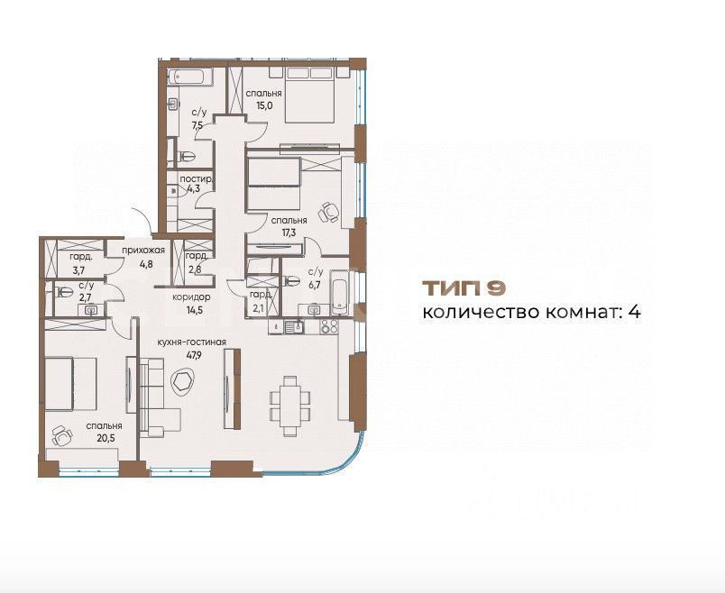 Функциональная планировка: кухня-гостиная, 3-4 пальни, 3 санузла, 3 гардеробные.