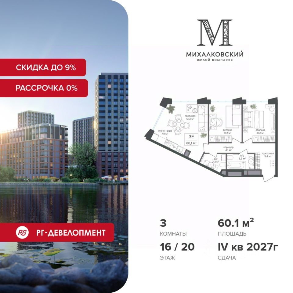 Продаётся 3-к квартира 60,1 кв.м. в ЖК "Михалковский" на 16-м этаже 20 этажного дома.