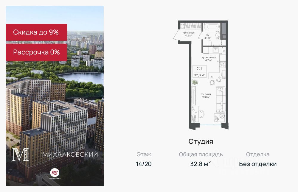 Продаётся студия 32,8 кв.м. в ЖК "Михалковский" на 14-м этаже 20 этажного дома.