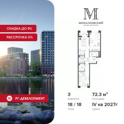 Продаётся 3-к квартира 72,3 кв.м. в ЖК "Михалковский" на 18-м этаже 18 этажного дома.